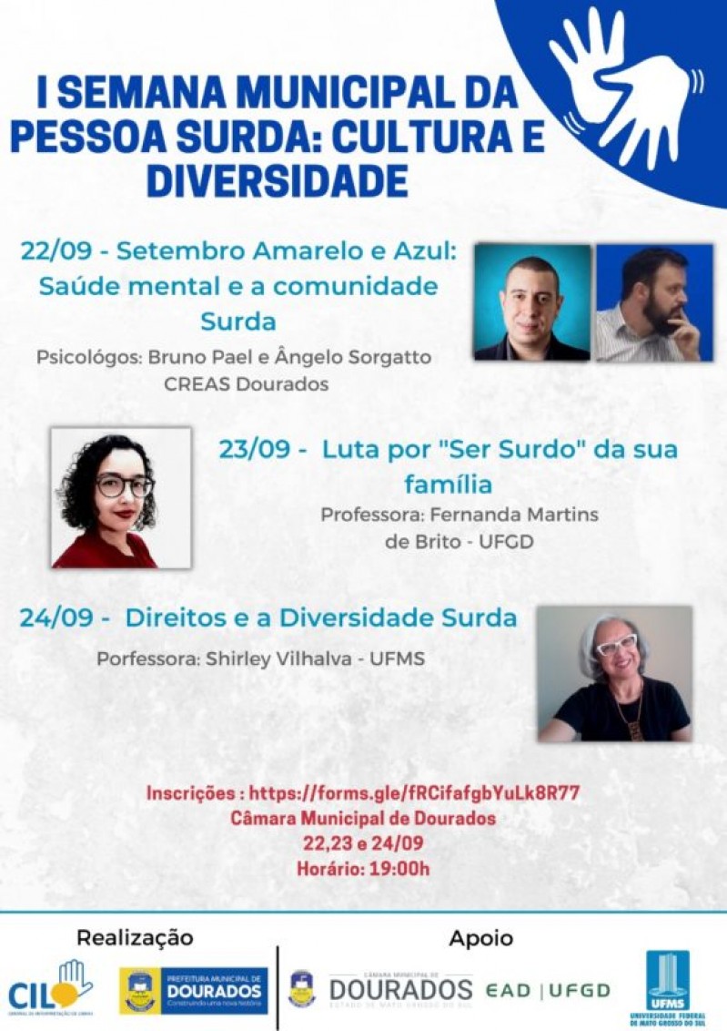 A Prefeitura de Dourados, por meio da CIL (Central de Interpretação de Libras), realizará a “I Semana Municipal da Pessoa Surda: Cultura e Diversidade”. Na programação, três palestras que acontecerão nesta quarta (22), quinta (23) e sexta (24), a partir das 19h, na Câmara Municipal.