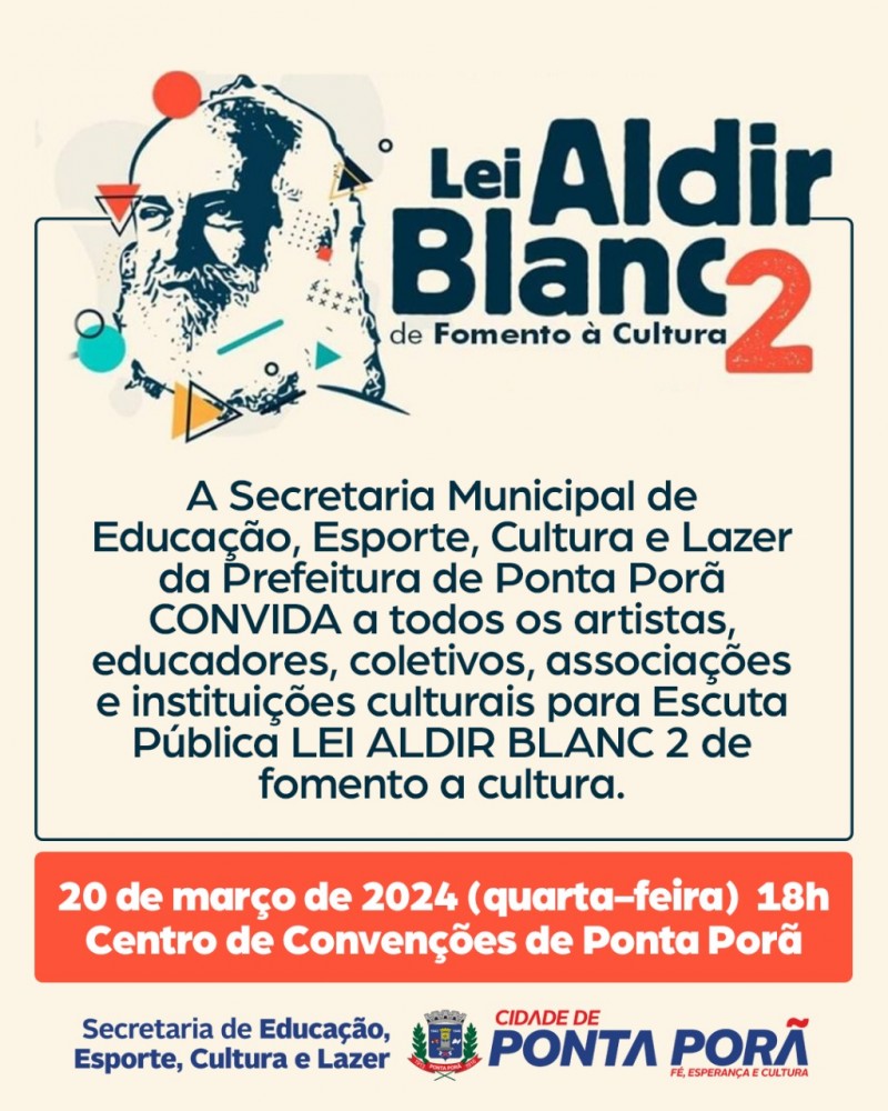 Na quarta-feira, 20, a Prefeitura de Ponta Porã por meio da Secretaria Municipal de Educação, Esporte, Cultura e Lazer-Gerência de Cultura vai realizar a primeira Escuta Pública sobre Lei Aldir Blanc 2. O evento acontece às 18h, no Centro de Convenções de Ponta Porã localizado na Rua Eraldo Moreira (Horto Florestal-Centro).