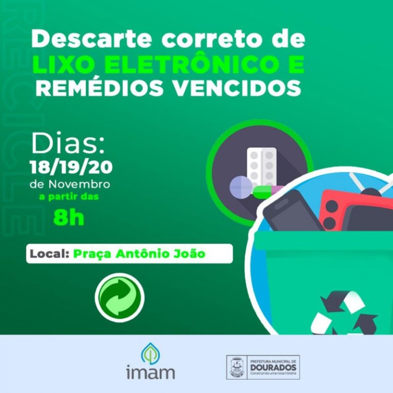 A Prefeitura de Dourados, através do Imam (Instituto do Meio Ambiente de Dourados), preparou três dias de arrecadação de lixo eletrônico e medicamentos vencidos. A ação começa nesta quinta-feira (18) , e segue na sexta-feira (19) das 8h às 17h e no sábado (20), das 8h às 12h na praça A...