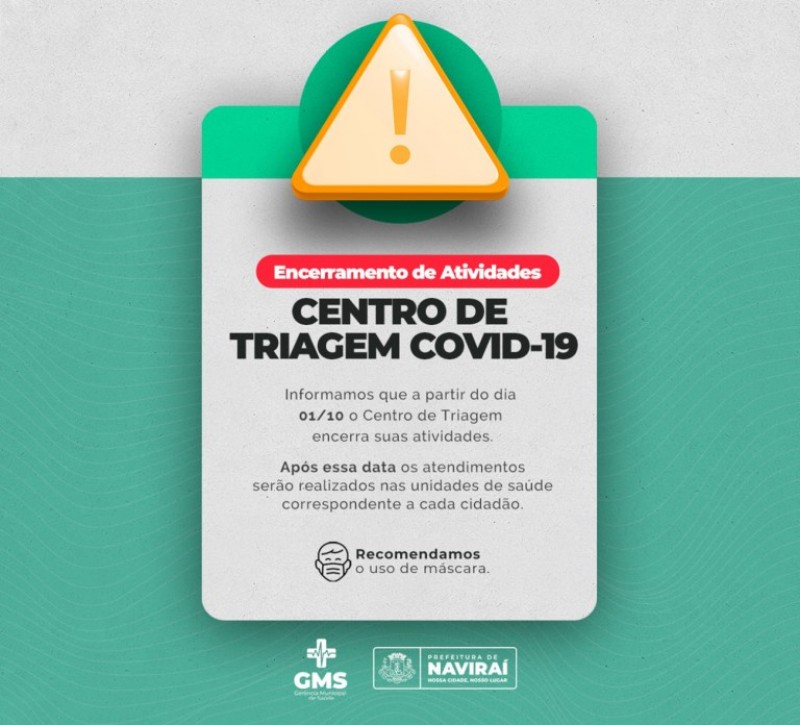 O Governo Municipal de Naviraí, através da Gerência de Saúde, informa a população naviraiense que, a partir deste sábado (01/10), se encerram as atividades do Centro de Triagem COVID- 19, que funciona até esta sexta-feira (30/09) ao lado do Hemonúcleo na Avenida Amélia Fukuda, 776, esquina com a Avenida Pantanal.