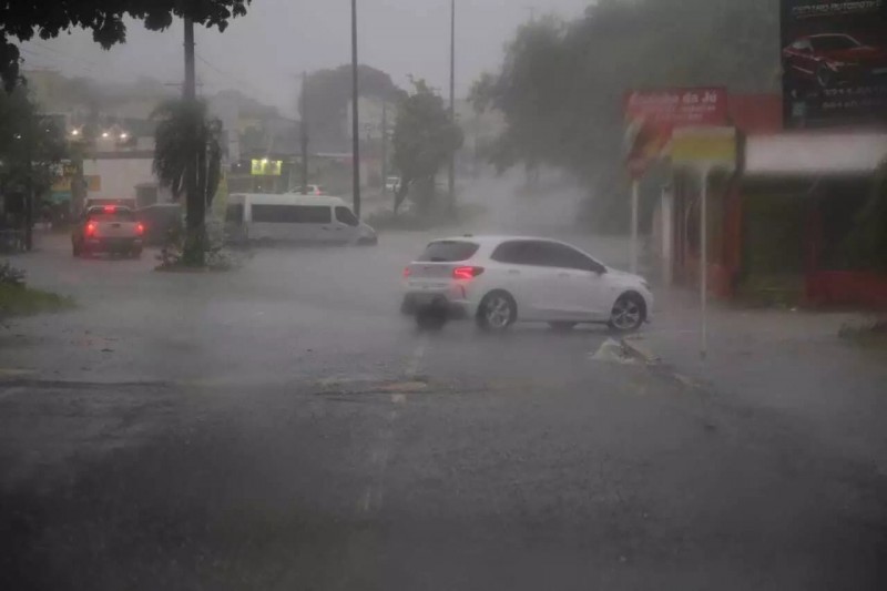 Córrego transborda e motoristas se arriscam para atravessar via em Campo Grande
