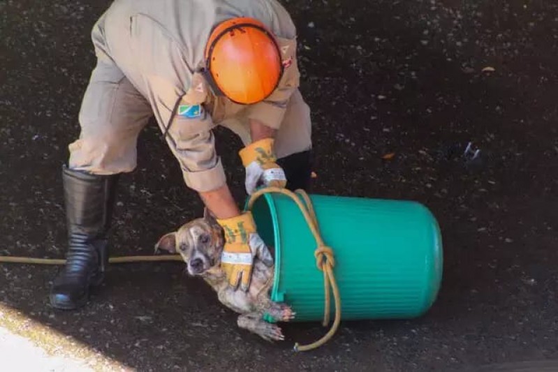 Cachorro cai em rio em Campo Grande, e é resgatado pelos bombeiros com pernas quebradas